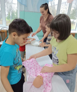 В преддверии самого нежного и милого праздника - Дня матери в группе «Солнышко» прошло мероприятие. Сегодня ребята перенеслись в свое недалекое будущее и представили то время, когда сами станут родителями. А чтобы стать хорошими родителями необходимо, конечно же, научиться правильно ребеночка пеленать, держать на руках и другим нехитрым премудростям материнства. Сколько нежности и чуткости исходило от ребятишек, когда они хлопотали с игрушечными пупсами и пеленками. После успешного практикума: как правильно передавать ребеночка из рук в руки и укачивать его, ребята учились петь колыбельные песни. В конце встречи они взяли в руки цветные карандаши и изобразили на бумаге свою будущую семью. Сегодня наши младшие воспитанники усвоили самое главное правило мудрой мамы – терпение и внимательность.